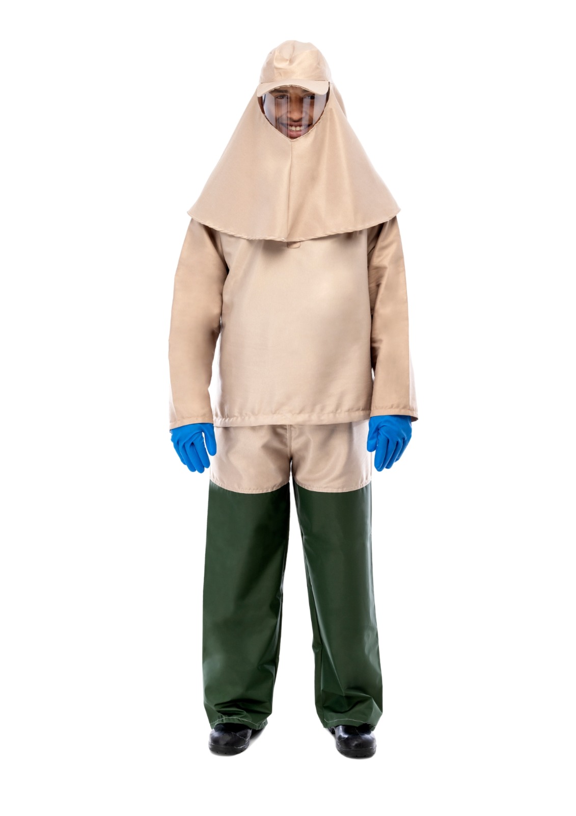 Vestimenta de proteção de corpo inteiro confeccionada em tecido de fios de algodão e poliéster com tratamento hidrorrepelente e eventualmente material impermeável nas perneiras.