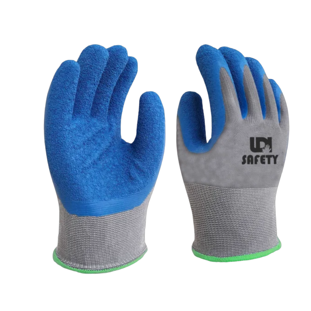 Luva de segurança confeccionada em fibras sintéticas, revestimento em borracha natural antiderrapante na palma, face palmar dos dedos e ponta dos dedos, punho tricotado nas mesmas fibras, acabamentos em overloque.